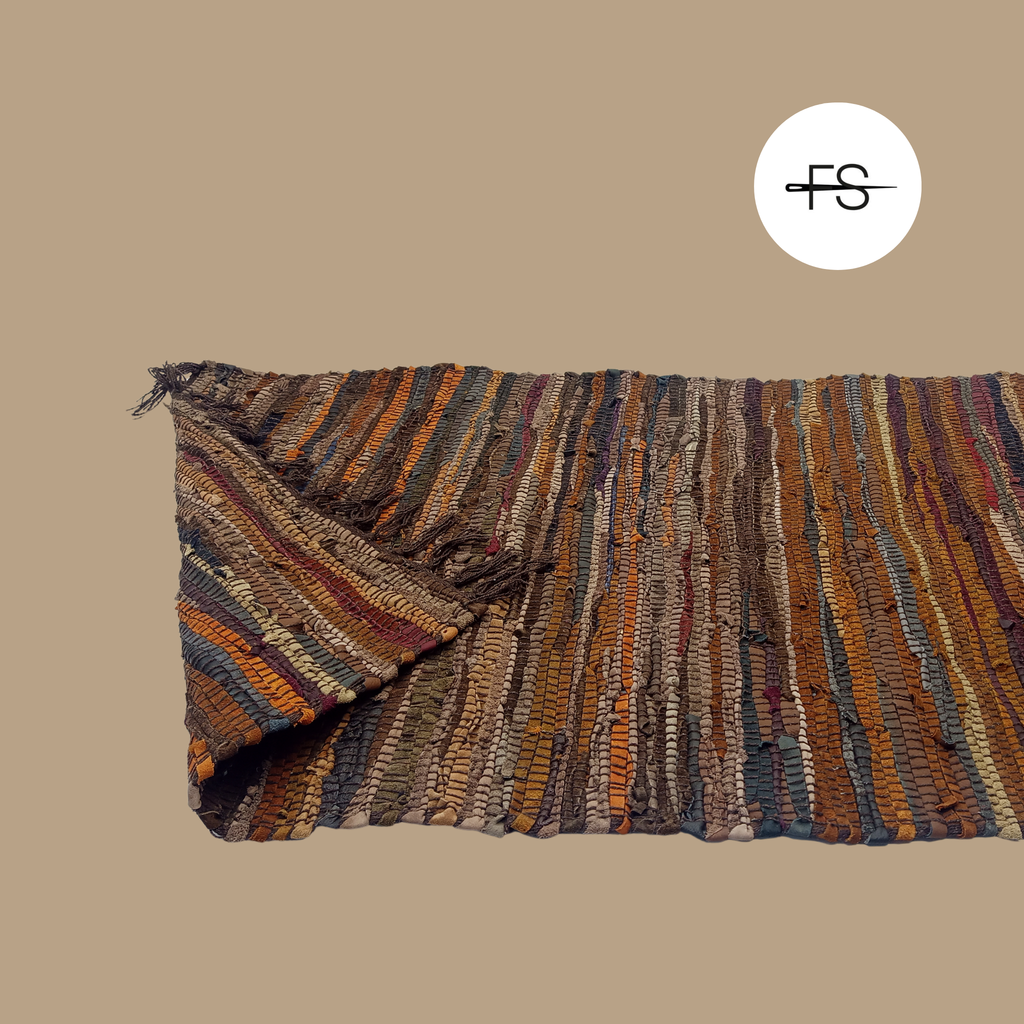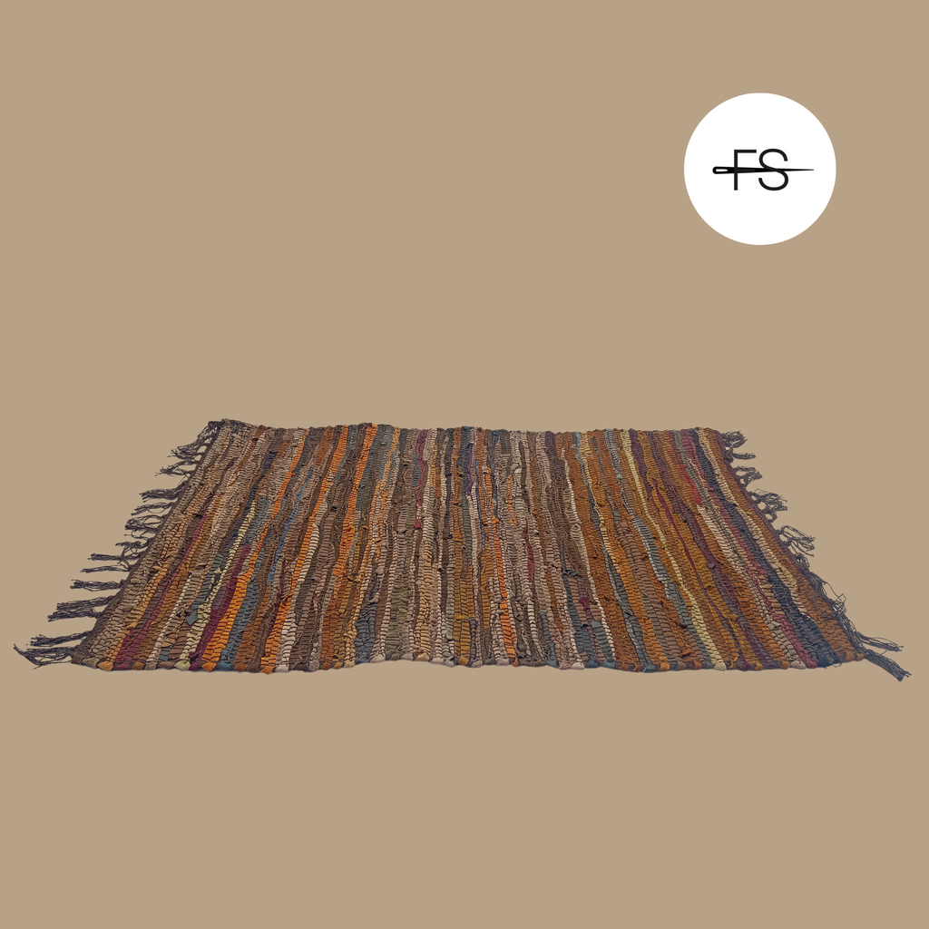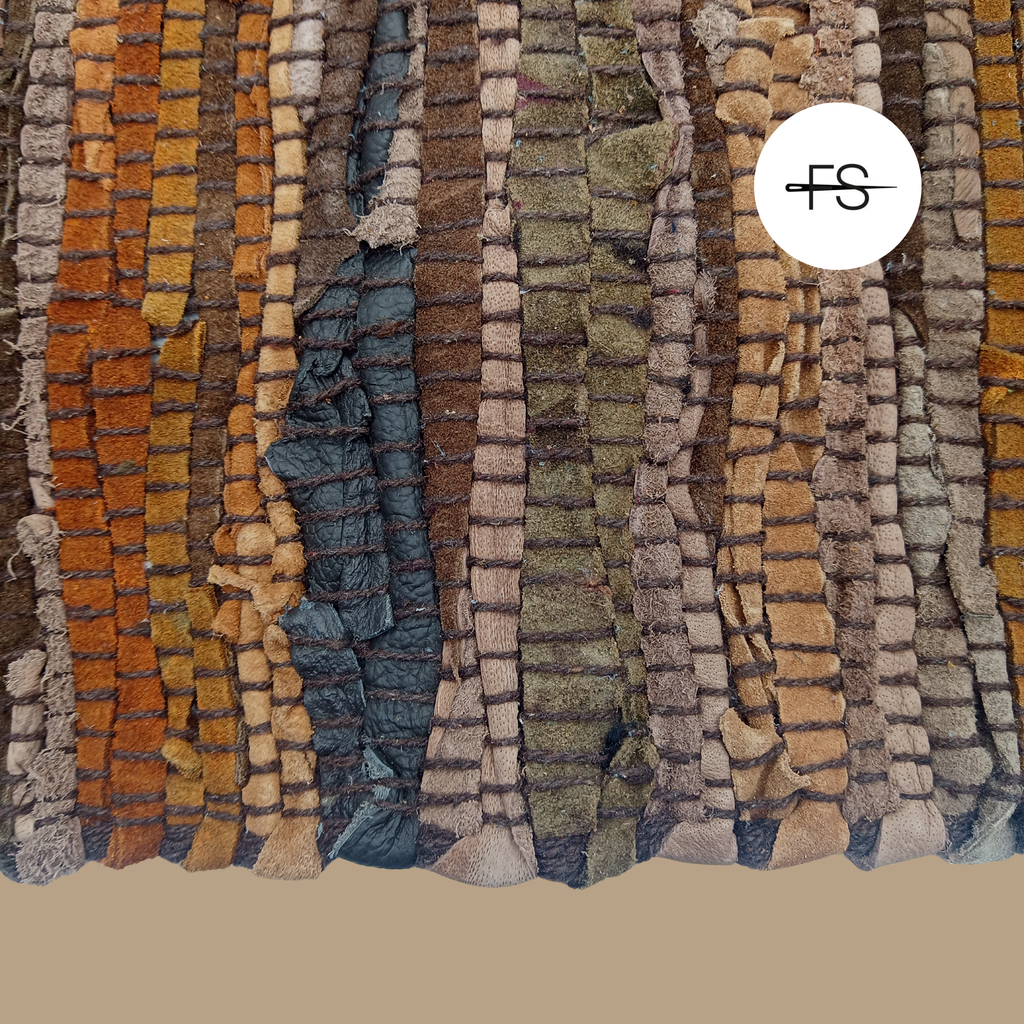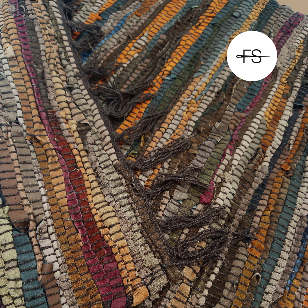 Bohemian inspired rug. Made from upcycled vinyl and genuine leather to create this detailed unfinished look.