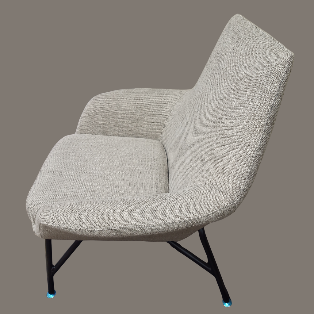 Ready made armchair in a 'Prince' style. It's both modern and comfortable. This chair is made from our fabric in our Meridian collection. It's a warm beige grey with a bold woven texture.